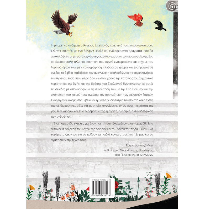 Τι μπορεί να συζητάει ο Άγγελος Σικελιανός, ένας από τους σημαντικότερους Έλληνες ποιητές, με ένα δελφίνι; Πολλά και ενδιαφέροντα πράγματα, που θα ανακαλύψουν οι μικροί αναγνώστες διαβάζοντας αυτό το παραμύθι. Γραμμένο σε γλώσσα απλή αλλά και ποιητική, που συχνά ενσωματώνει και στίχους του λυρικού ήρωά του, με εικονογράφηση πλούσια σε χρώμα και ευρηματική σε σχέδιο, το βιβλίο «ταξιδεύει» τον αναγνώστη ακολουθώντας τις περιπλανήσεις του Άγγελου τόσο στον χώρο όσο και στον χρόνο της πατρίδας του. Σημαντικά περιστατικά της ζωής και της δράσης του Σικελιανού ζωντανεύουν σε αυτές τις σελίδες με αποκορύφωμα τη συνάντησή του με την Εύα Πάλμερ και την υλοποίηση του κοινού τους ονείρου, την πραγμάτωση των Δελφικών Εορτών. Έκδηλη είναι ακόμη στο βιβλίο και η βαθιά φυσιολατρία του ποιητή και η πίστη του σε διαχρονικές αξίες για τις οποίες αγωνίστηκε, όπως είναι η ιερότητα της γης, των καρπών και των πλασμάτων της, η αγάπη, η ειρήνη, η συναδέλφωση των ανθρώπων.
