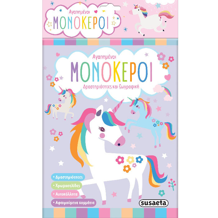 Διασκέδασε µε δραστηριότητες γεµάτες αγαπηµένους µονόκερους, ζωγραφική, αυτοκόλλητα, ταµπελάκια για την πόρτα του δωµατίου σου, ετικέτες και φυσικά µια στέκα-µονόκερο για λαµπερές εµφανίσεις!
