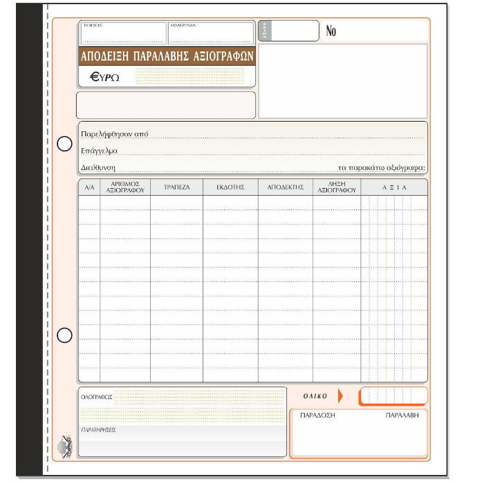 Λογιστικό έντυπο με στήλες για αναλυτικές πληροφορίες για τη παραλαβή αξιογράφων