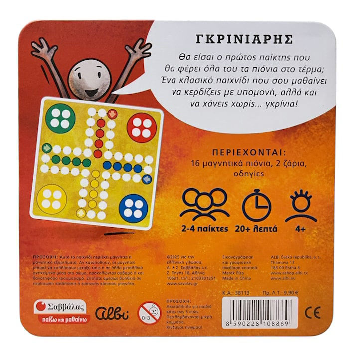 Με απλούς και εύκολους κανόνες, ενισχύει τη συγκέντρωση, την υπομονή και την κοινωνική αλληλεπίδραση. Το σετ περιλαμβάνει τα πιόνια, το ζάρι και ταμπλό, έτοιμα να ταξιδέψουν παίκτες κάθε ηλικίας στον συναρπαστικό κόσμο του πιο... γκρινιάρικου παιχνιδιού!