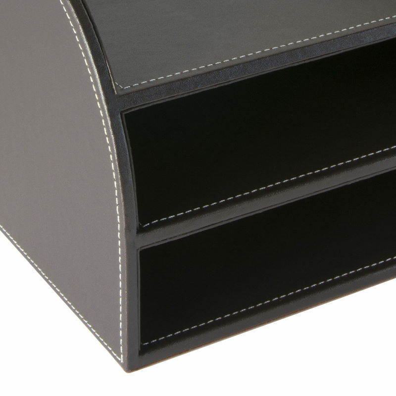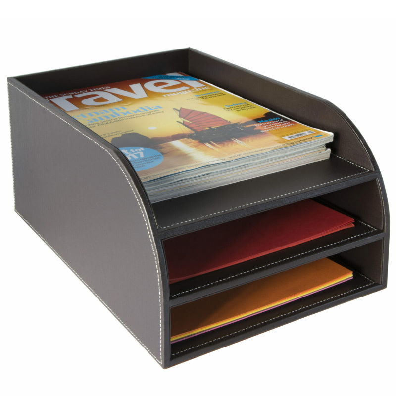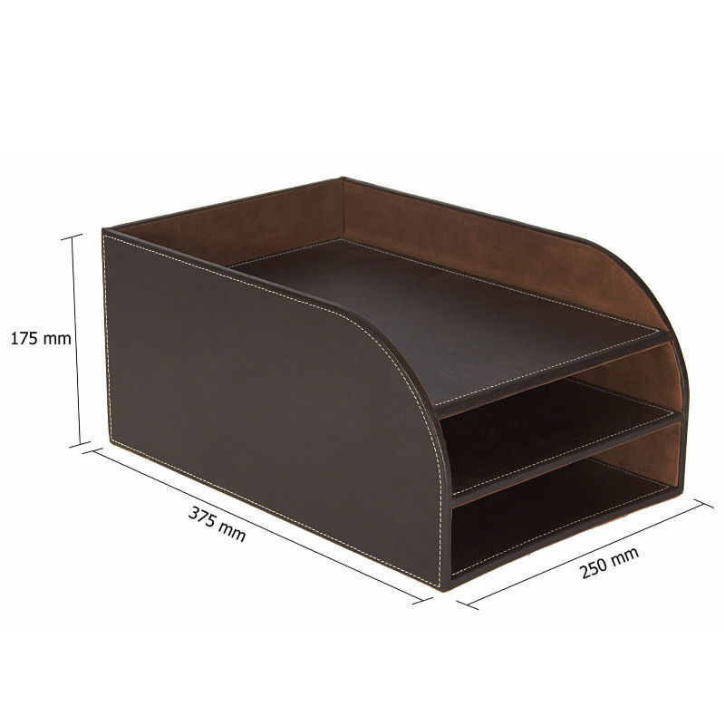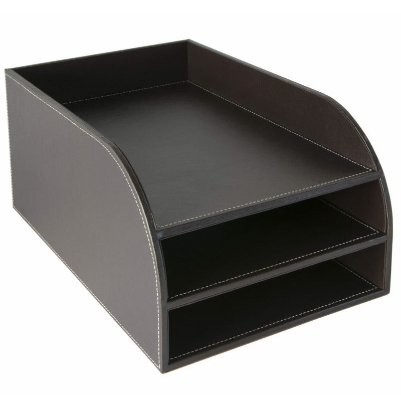 Δίσκος γραφείου δερμάτινος Osco για την οργάνωση και την αποθήκευση μηνυμάτων, φακέλων και άλλων εγγράφων διαστάσεων Α4. Με τη σταθερή κατασκευή και τον κλασικό σχεδιασμό, αυτός ο δίσκος είναι μια κομψή προσθήκη σε οποιοδήποτε γραφείο στο σπίτι ή το γραφείο. Οι τρεις ξεχωριστές του θέσεις σας βοηθούν να οργανώσετε χαρτιά ή ξεχωριστούς τύπους χαρτιού για τον εκτυπωτή και τις επιστολές σας. Ιδανικό για να κρατάτε το γραφείο σας καθαρό και απαλλαγμένο από ακαταστασία.