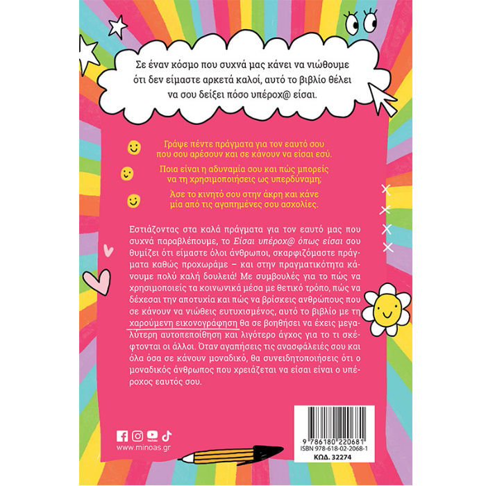 Εστιάζοντας στα καλά πράγματα για τον εαυτό μας που συχνά παραβλέπουμε, το Είσαι υπέροχ@ όπως είσαι σου θυμίζει ότι είμαστε όλοι άνθρωποι, σκαρφιζόμαστε πράγματα καθώς προχωράμε – και στην πραγματικότητα κάνουμε πολύ καλή δουλειά! Με συμβουλές για το πώς να χρησιμοποιείς τα κοινωνικά μέσα με θετικό τρόπο, πώς να δέχεσαι την αποτυχία και πώς να βρίσκεις ανθρώπους που σε κάνουν να νιώθεις ευτυχισμένος, αυτό το βιβλίο με τη χαρούμενη εικονογράφηση θα σε βοηθήσει να έχεις μεγαλύτερη αυτοπεποίθηση και λιγότερο άγχος για το τι σκέφτονται οι άλλοι. Όταν αγαπήσεις τις ανασφάλειές σου και όλα όσα σε κάνουν μοναδικό, θα συνειδητοποιήσεις ότι ο μοναδικός άνθρωπος που χρειάζεται να είσαι είναι ο υπέροχος εαυτός σου.