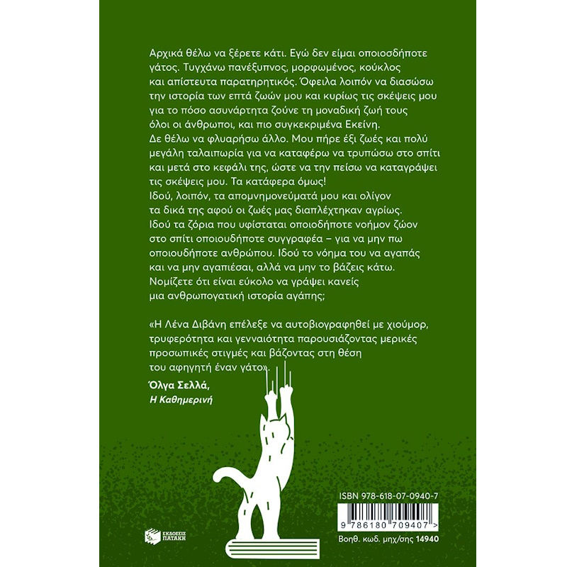 Αρχικά θέλω να ξέρετε κάτι. Εγώ δεν είμαι οποιοσδήποτε γάτος. Τυγχάνω πανέξυπνος, μορφωμένος, κούκλος και απίστευτα παρατηρητικός. Όφειλα λοιπόν να διασώσω την ιστορία των επτά ζωών μου και κυρίως τις σκέψεις μου για το πόσο ασυνάρτητα ζούνε τη μοναδική ζωή τους όλοι οι άνθρωποι, και πιο συγκεκριμένα Εκείνη. Δε θέλω να φλυαρήσω άλλο. Μου πήρε έξι ζωές και πολύ μεγάλη ταλαιπωρία για να καταφέρω να τρυπώσω στο σπίτι και μετά στο κεφάλι της, ώστε να την πείσω να καταγράψει τις σκέψεις μου. Τα κατάφερα όμως!