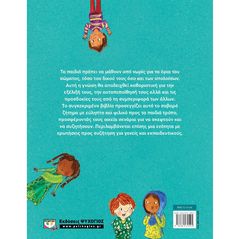 Τα παιδιά πρέπει να μάθουν από νωρίς για τα όρια του σώματος, τόσο του δικού τους όσο και των υπολοίπων. Αυτή η γνώση θα αποδειχθεί καθοριστική για την εξέλιξή τους, την αυτοπεποίθησή τους αλλά και τις προσδοκίες τους από τη συμπεριφορά των άλλων. Το συγκεκριμένο βιβλίο προσεγγίζει αυτό το σοβαρό ζήτημα με εύληπτο και φιλικό προς τα παιδιά τρόπο, προσφέροντάς τους οικεία σενάρια για να σκεφτούν και να συζητήσουν. Περιλαμβάνεται επίσης μια ενότητα με ερωτήσεις προς συζήτηση για γονείς και εκπαιδευτικούς.