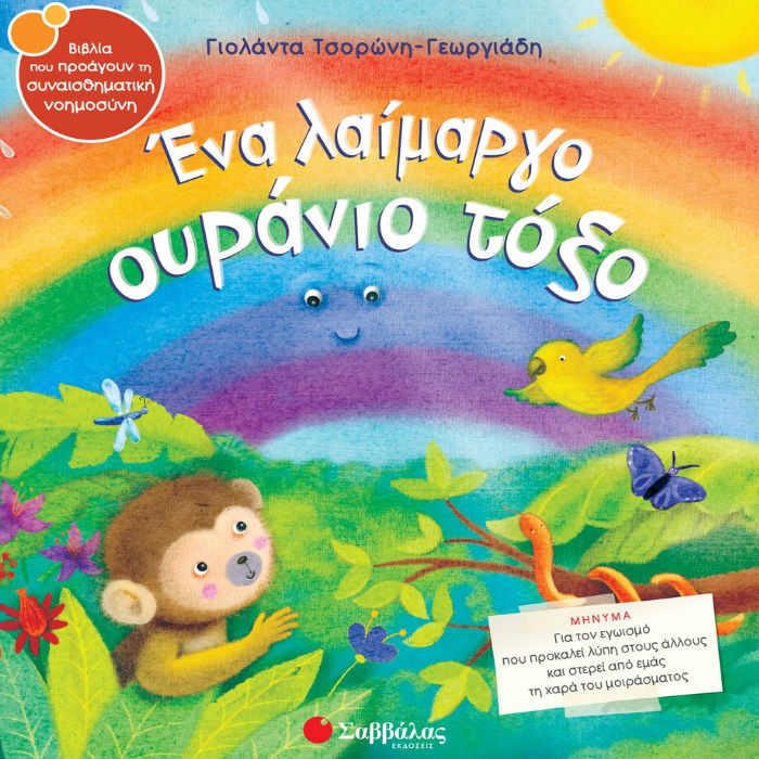 Το βιβλίο: Ένα τόσο δα ουράνιο τόξο δημιουργεί μεγάλο πρόβλημα στο τροπικό δάσος. Καταβροχθίζει τα χρώματα δέντρων, ζώων, πουλιών. Παχύ παχύ ανεβαίνει στον ουρανό και όλα πίσω του τα αφήνει γκρίζα. Το λαίμαργο ουράνιο τόξο θα μάθει να μοιράζεται; Και πώς το δάσος θα πάρει πίσω τα υπέροχα χρώματά του;