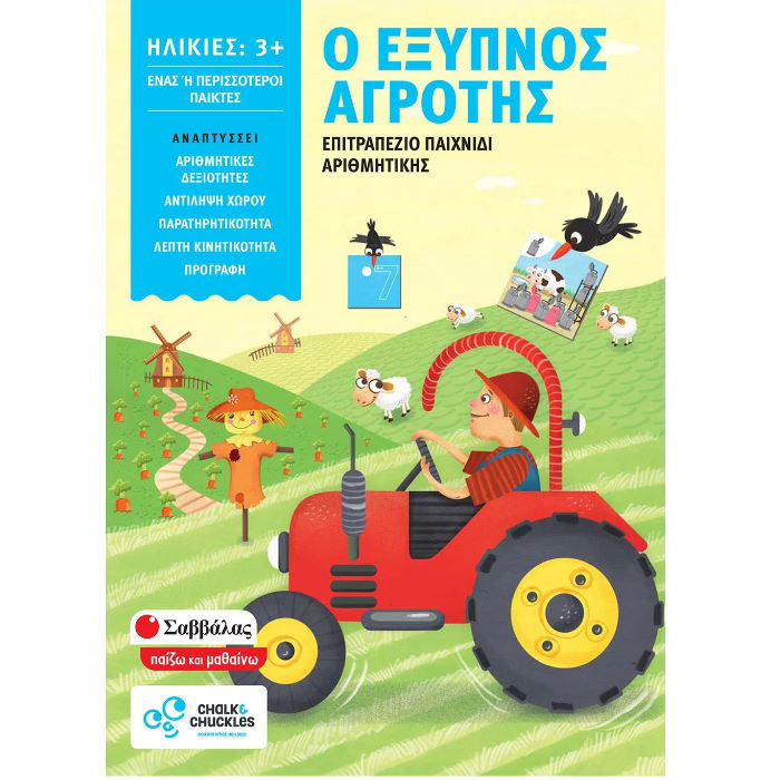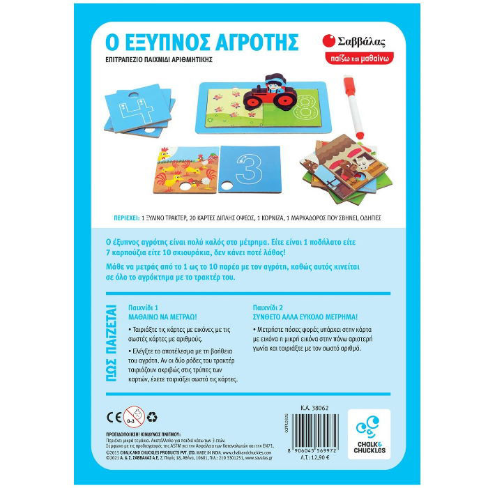 Περιέχει: 1 ξύλινο τρακτέρ, 20 κάρτες διπλής όψης, 1 κορνίζα, 1 μαρκαδόρο που σβήνει, οδηγίες.