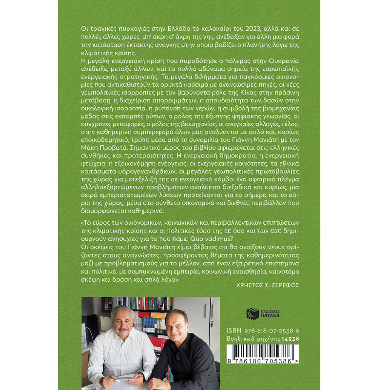 Η μεγάλη ενεργειακή κρίση που πυροδότησε ο πόλεμος στην Ουκρανία ανέδειξε, μεταξύ άλλων, και τα πολλά αδύναμα σημεία της ευρωπαϊκής ενεργειακής στρατηγικής. Τα μεγάλα διλήμματα για παγκόσμιες οικονομίες που αντικαθιστούν τα ορυκτά καύσιμα με ανανεώσιμες πηγές, οι νέες γεωπολιτικές ισορροπίες με τον βαρύνοντα ρόλο της Κίνας στην πράσινη μετάβαση, η διαχείριση απορριμμάτων, η σπουδαιότητα των δασών στην οικολογική ισορροπία, η ρύπανση των νερών, η συμβολή της βιομηχανίας μόδας στις εκπομπές ρύπων, ο ρόλος της έξυπνης ψηφιακής γεωργίας, οι σύγχρονες μεταφορές, ο ρόλος της βιομηχανίας, οι αναγκαίες αλλαγές, τέλος, στην καθημερινή συμπεριφορά όλων μας αναλύονται με απλό και, κυρίως εποικοδομητικό, τρόπο μέσα από τη συνομιλία του Γιάννη Μανιάτη με τον Μάκη Προβατά.