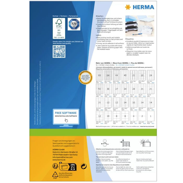 Σχεδιασμένες για εκτυπωτές inkjet, laser και φωτοαντιγραφικά, οι ετικέτες Herma προσφέρουν αξιόπιστη απόδοση σε κάθε τύπο χαρτιού και θερμοκρασίας. Η κοπή τους είναι απόλυτα ακριβής, εξασφαλίζοντας εύκολη αποκόλληση και άψογη τοποθέτηση χωρίς φουσκώματα ή υπολείμματα κόλλας.