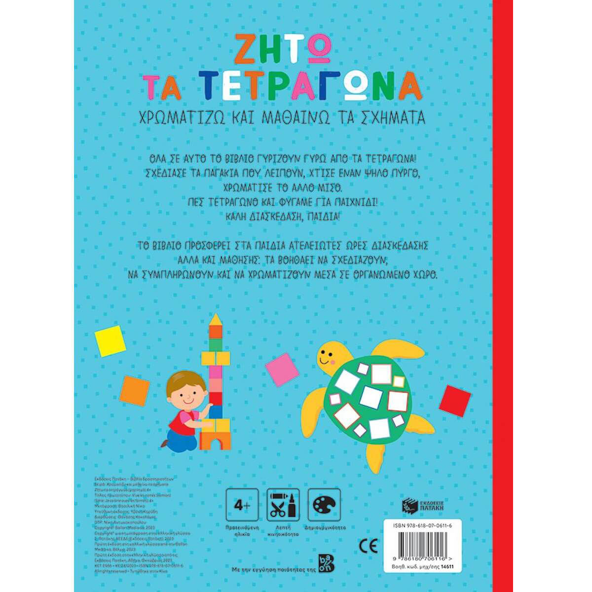 Όλα σε αυτό το βιβλίο γυρίζουν γύρω από τα τετράγωνα! Σχεδίασε τα παγάκια που λείπουν, χτίσε έναν ψηλό πύργο, χρωμάτισε το άλλο μισό. Πες τετράγωνο και φύγαμε για παιχνίδι! Καλή διασκέδαση, παιδιά! Το βιβλίο προσφέρει στα παιδιά ατελείωτες ώρες διασκέδασης αλλά και μάθησης: τα βοηθάει να σχεδιάζουν, να συμπληρώνουν και να χρωματίζουν μέσα σε οργανωμένο χώρο.