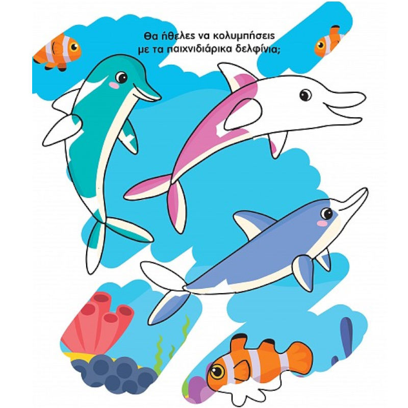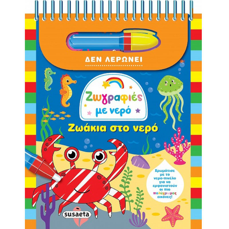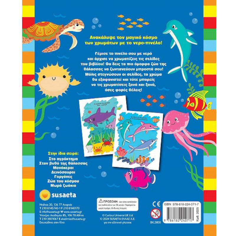 Ανακάλυψε τον μαγικό κόσμο των χρωμάτων με το νερο-πινέλο! Γέμισε το πινέλο σου με νερό και άρχισε να χρωματίζεις τις σελίδες του βιβλίου! Θα δεις τα πιο όμορφα ζώα της θάλασσας να ζωντανεύουν μπροστά σου! Μόλις στεγνώσουν οι σελίδες, το χρώμα θα εξαφανιστεί και τότε μπορείς να τις χρωματίσεις ξανά και ξανά, όσες φορές θέλεις!