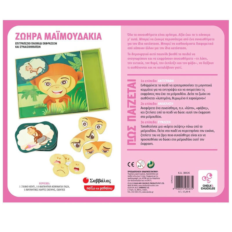 Το δημιουργικό αυτό παιχνίδι βοηθά τα παιδιά να αναγνωρίσουν και να εκφράσουν συναισθήματα -τη λύπη, την ευτυχία, τον θυμό, την έκπληξη και τον φόβο-, να δείξουν τι αισθάνονται και να καταλάβουν γιατί.