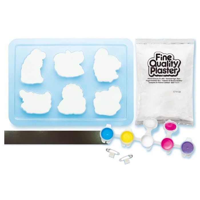 - Περιεχόμενο: 6 καλούπια 1 σακουλάκι γύψος χρώματα πινέλο μαγνήτες καρφίτσες