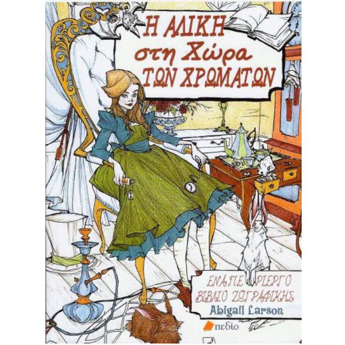 Ένα ασυνήθιστο βιβλίο ζωγραφικής εμπνευσμένο από τη φαντασία του Λιούις Κάρολ και σχεδιασμένο από την Αμπιγκέιλ Λάρσον, Η Αλίκη στη Χώρα των Χρωμάτων, ζωντανεύει μαγικές και ονειρικά όμορφες σκηνές. Οι αναγνώστες μπορούν να πάρουν τα χρωματιστά τους μολύβια και να τρυπώσουν στην κουνελότρυπα... για να χρωματίσουν 70 γοητευτικά σχέδια συντροφιά με την Αλίκη. Μια Αλίκη που γίνεται άλλοτε γίγαντας και άλλοτε νάνος, πηγαίνει σε τρελά πάρτι με τσάι, δέχεται συμβουλές από μια κάμπια και αντιμετωπίζει με θάρρος βασίλισσες και βαλέδες! Οι αναγνώστες έχουν την ευκαιρία να χαλαρώσουν και να διασκεδάσουν χρωματίζοντας αγαπημένες σκηνές του κλασικού παραμυθιού και αναπάντεχα μοτίβα από μανιτάρια, φλιτζάνια και μπουκάλια με την ετικέτα "Πιες με".
