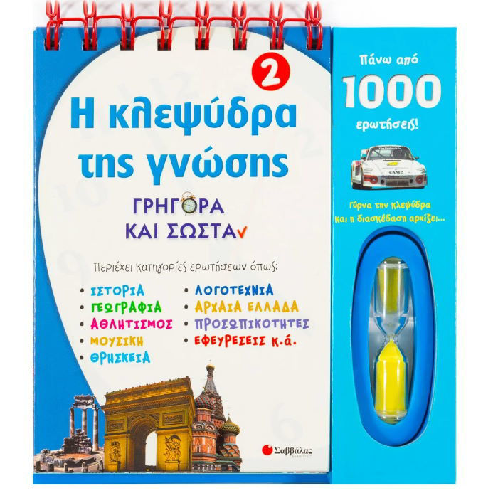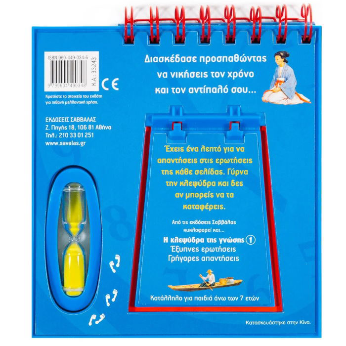 Διασκέδασε προσπαθώντας να νικήσεις τον χρόνο και τον αντίπαλό σου... Έχεις ένα λεπτό για να απαντήσεις στις ερωτήσεις της κάθε σελίδας. Γύρνα την κλεψύδρα και δες αν μπορείς να τα καταφέρεις. Περιέχει κατηγορίες ερωτήσεων όπως: Ιστορία, γεωγραφία, αθλητισμός, μουσική, θρησκεία, λογοτεχνία, αρχαία Ελλάδα, προσωπικότητες, εφευρέσεις κ.ά.