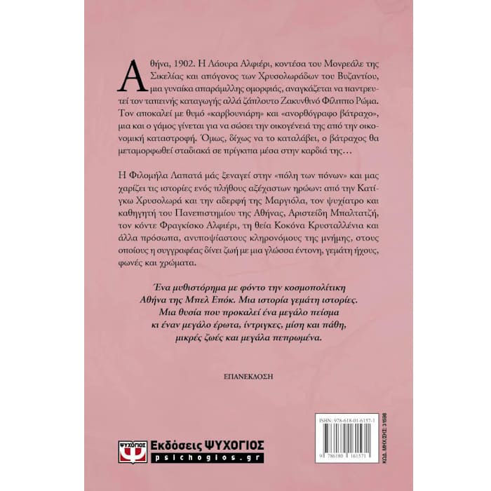 Η Φιλομήλα Λαπατά μας μεταφέρει στην Αθήνα της Μπελ Επόκ, μέσα από μια αφήγηση γεμάτη πάθη, έρωτες, θυσίες και ανατροπές. Μέσα από χαρακτήρες που ζωντανεύουν με πλούσια γλώσσα και ατμόσφαιρα, το μυθιστόρημα σκιαγραφεί την κοσμοπολίτικη αλλά και αντιφατική πόλη των αρχών του 20ού αιώνα, όπου συγκρούονται τα μεγάλα ιδανικά με τα ανθρώπινα αδύναμα πάθη.