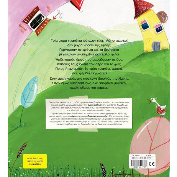 Τρία μικρά πλατάνια φύτεψαν πλάι πλάι οι χωρικοί στο μικρό νησάκι της λίμνης. Περνούσαν τα χρόνια και τα δεντράκια μεγάλωναν αγαπημένα σαν καλοί φίλοι. Ήρθε καιρός όμως που μαράζωσαν τα δυο. Κάποιος τους έκλεβε τον αέρα και το φως. Ποιος ήταν αυτός; Το τρίτο πλατάνι, φυσικά, που φέρθηκε εγωιστικά. Στην αρχή καμάρωνε που έγινε βασιλιάς της λίμνης. Όταν όμως κατάλαβε πως είχε απομείνει μοναχό, χωρίς φίλους και παρέα…