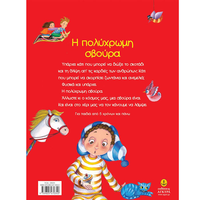Υπάρχει κάτι που μπορεί να διώξει το σκοτάδι και τη θλίψη απ τις καρδιές των ανθρώπων; Κάτι που μπορεί να σκορπίσει ζωντάνια και ανεμελιά; Φυσικά και υπάρχει. Η πολύχρωμη σβούρα. Άλλωστε κι ο κόσμος μας μια σβούρα είναι. Και είναι στο χέρι μας να τον κάνουμε να λάμψει. Ο μικρός Αλέξης ανεβαίνει στη σοφίτα που ζούσε ο παππούς του. Εκεί μέσα σε ένα σεντούκι γεμάτο παιχνίδια ανακαλύπτει μια χρωματιστή σβούρα. Όταν την παίρνει στα χέρια του η σβούρα λάμπει και σκορπίζει γύρω της χρώματα. Ο Αλέξης γίνεται πολύχρωμος. Το ίδιο συμβαίνει και με όποιον έρχεται σε επαφή με την πολύχρωμη σβούρα. Αυτό που πρόκειται να ακολουθήσει θα αλλάξει τη διάθεση του σπιτιού του του σχολείου του της πόλης του αλλά και του κόσμου όλου. Η ιστορία μιλάει για τη μεταδοτική δύναμη της αισιοδοξίας και τη ματιά των παιδιών που βλέπουν έναν κόσμο πιο όμορφο πιο ζωντανό και πιο λαμπερό από εκείνον που αντιλαμβάνονται οι μεγάλοι.