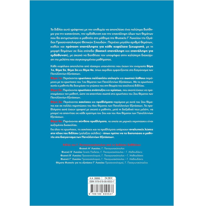 Το βιβλίο αυτό θα αποτελέσει ένα πολύτιμο βοήθημα για την κατανόηση, την εμβάθυνση και την επανάληψη όλων των θεμάτων που θα αντιμετωπίσει ο μαθητής στο μάθημα της Φυσικής Γ΄ Λυκείου της Ομάδας Προσανατολισμού Θετικών Σπουδών. Περιέχει μεγάλο αριθμό θεμάτων, καθώς και πρόταση επανάληψης για κάθε κεφάλαιο ξεχωριστά, με τη μορφή βημάτων, σε δύο επίπεδα (βασική επανάληψη και επανάληψη για εμβάθυνση) με σκοπό να βοηθήσει τον υποψήφιο στην καλύτερη διαχείριση της μελέτης του συγκεκριμένου μαθήματος.