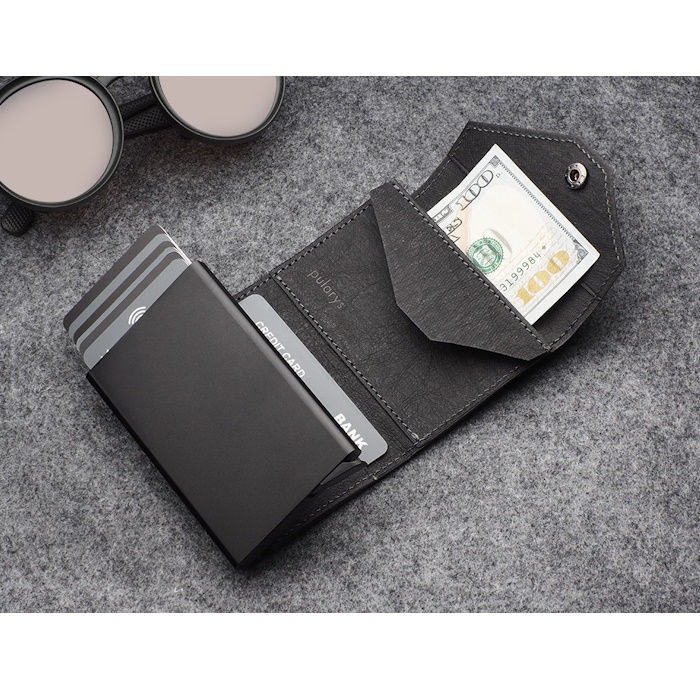 Εσωτερικά μια τσέπη για έγγραφα ή επαγγελματικές κάρτες και μια πρόσθετη τσέπη για κέρματα, κλειστή με πτερύγιο. Θα αποθηκεύσετε τα τραπεζογραμμάτια σας σε ένα μοναδικό διαμέρισμα κατασκευασμένο εξ ολοκλήρου από χαρτί πλύσης. Ένας ειδικός μηχανισμός σταδιακής εκτίναξης εξασφαλίζει γρήγορη και εύκολη πρόσβαση στις κάρτες. Χάρη στην τεχνολογία αποκλεισμού RFID που χρησιμοποιείται στη σχεδίαση του πορτοφολιού, τα ευαίσθητα δεδομένα και τα χρήματα της πιστωτικής σας κάρτας είναι απολύτως ασφαλή και προστατεύονται από μη εξουσιοδοτημένη σάρωση ή κλοπή.