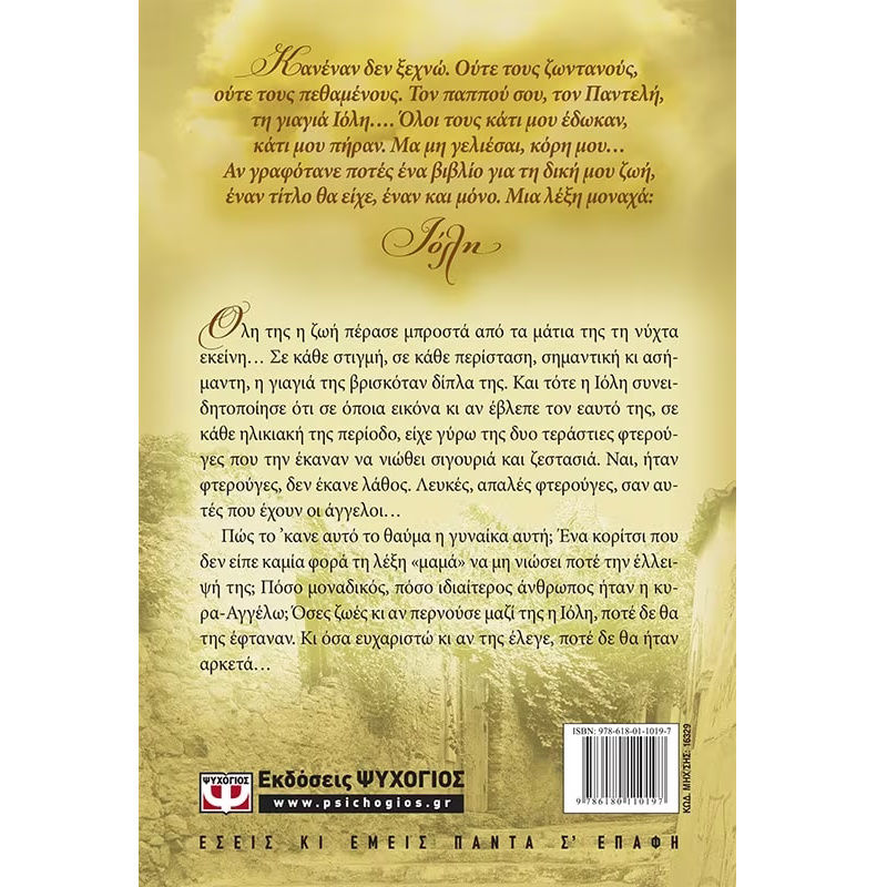 Όλη της η ζωή πέρασε μπροστά από τα μάτια της τη νύχτα εκείνη… Σε κάθε στιγμή, σε κάθε περίσταση, σημαντική κι ασήμαντη, η γιαγιά της βρισκόταν δίπλα της. Και τότε η Ιόλη συνειδητοποίησε ότι σε όποια εικόνα κι αν έβλεπε τον εαυτό της, σε κάθε ηλικιακή της περίοδο, είχε γύρω της δυο τεράστιες φτερούγες που την έκαναν να νιώθει σιγουριά και ζεστασιά. Ναι, ήταν φτερούγες, δεν έκανε λάθος. Λευκές, απαλές φτερούγες, σαν αυτές που έχουν οι άγγελοι…