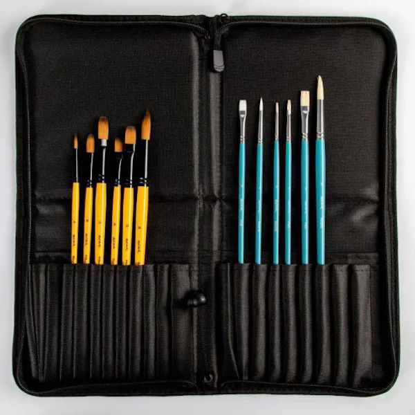 Το πορτοφόλι μας με πινέλο χωράει έως και 22 πινέλα ή μαχαίρια παλέτας. Μπορεί να χωρέσει κάθε βούρτσα μήκους έως 33 cm και διπλώνει επίπεδα για εύκολη μεταφορά και αποθήκευση. Είτε εργάζεστε στο στούντιο είτε στο χωράφι, κρατήστε τα πινέλα σας προστατευμένα και οργανωμένα με το πορτοφόλι μας με φερμουάρ.