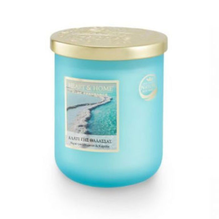 Μεσαίο κερί με άρωμα αύρα του ωκεανού και καρύδα σε γυάλινη συσκευασία της Heart & Home διάρκειας 30 ωρών.