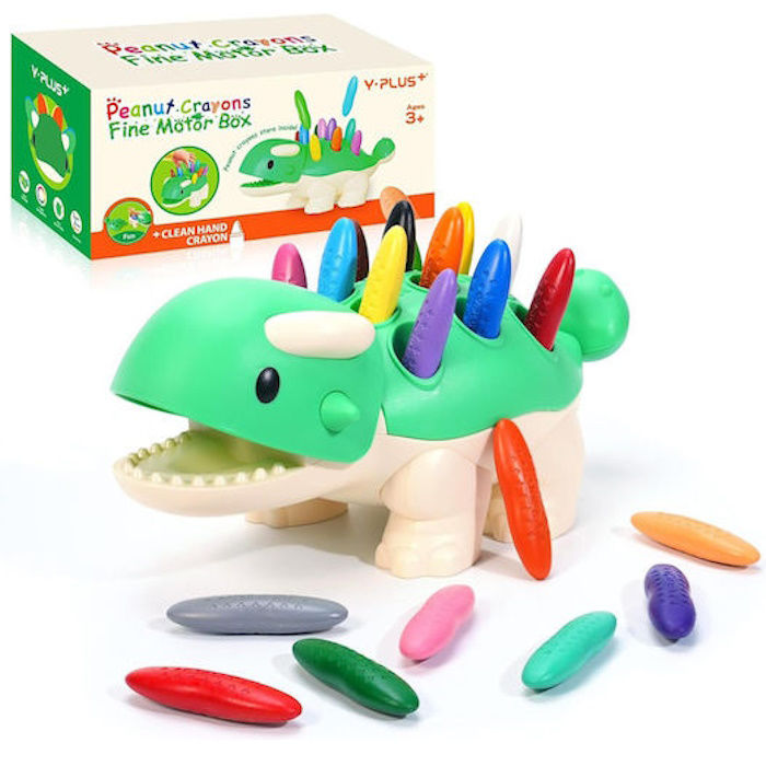 Το σετ περιλαμβάνει έναν χαριτωμένο δεινόσαυρο-κουτί αποθήκευσης και 24 κηρομπογιές σε σχήμα φιστικιού, ειδικά σχεδιασμένες για τα μικρά παιδικά χεράκια. Είναι ιδανικό για την ανάπτυξη λεπτής κινητικότητας, την ενίσχυση αισθητηριακών ερεθισμάτων και τη δημιουργική έκφραση μέσω ζωγραφικής.