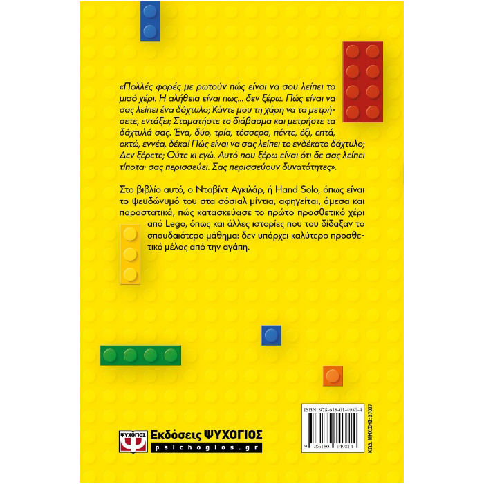Στο βιβλίο αυτό, ο Νταβίντ Αγκιλάρ, ή Hand Solo, όπως είναι το ψευδώνυμό του στα σόσιαλ μίντια, αφηγείται, άμεσα και παραστατικά, πώς κατασκεύασε το πρώτο προσθετικό χέρι από Lego, όπως και άλλες ιστορίες που του δίδαξαν το σπουδαιότερο μάθημα: δεν υπάρχει καλύτερο προσθετικό μέλος από την αγάπη.