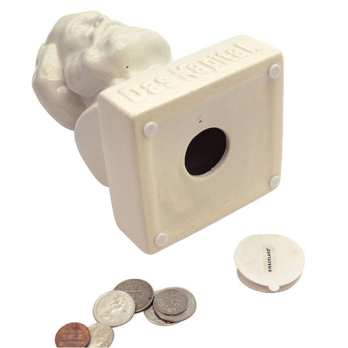 Κεραμικός κουμπαράς της εταιρίας Kikkerland, σε λευκό χρώμα, για να αποταμιεύσετε χρήματα και παράλληλα να διακοσμήσετε τον χώρο σας! Είναι κατασκευασμενός από υλικό που χρειάζεται προσοχή στις πτώσεις.