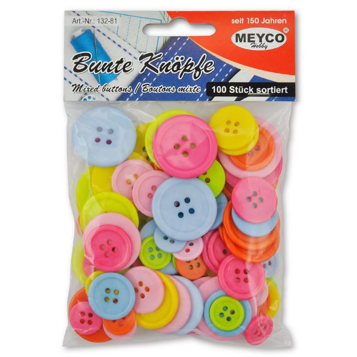 Το σετ πλαστικών κουμπιών Meyco περιλαμβάνει 100 τεμάχια σε ποικιλία χρωμάτων, σχημάτων και μεγεθών, ιδανικά για χειροτεχνίες, scrapbooking, ραπτική και DIY κατασκευές. Κατασκευασμένα από ποιοτικό πλαστικό, τα κουμπιά είναι ελαφριά, ανθεκτικά και κατάλληλα τόσο για παιδιά όσο και για ενήλικες.