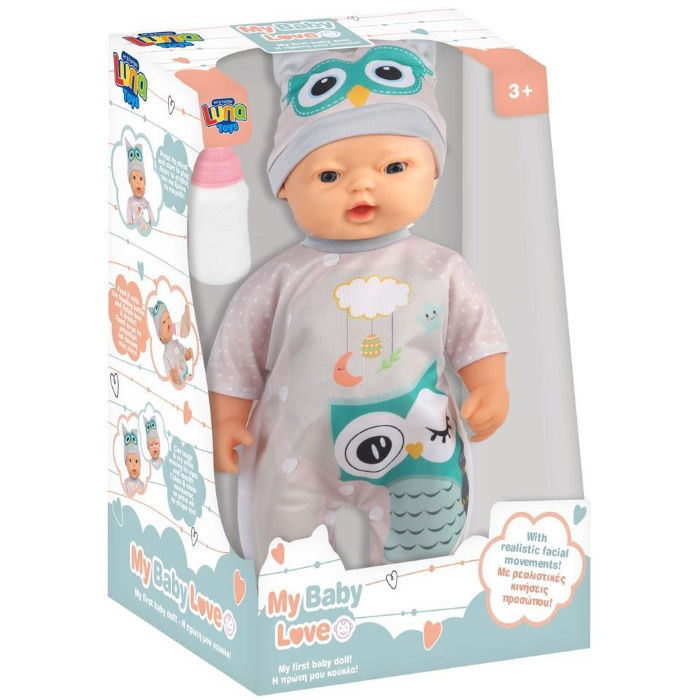 Κούκλα Μωρό 37,5 εκ. Luna Toys με αξεσουάρ και ήχο, ιδανικό παιχνίδι ρόλων που ενθαρρύνει τη φαντασία και την ανάπτυξη των κοινωνικών δεξιοτήτων. Η κούκλα διαθέτει ρεαλιστικές κινήσεις, γελάει και κλαίει, με τα μάτια και το στόμα της να κινούνται φυσικά, προσφέροντας μια ζωντανή και διαδραστική εμπειρία παιχνιδιού.