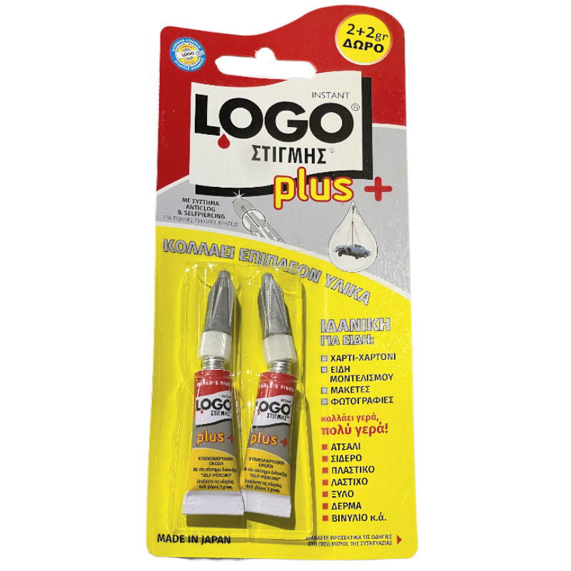 Nέα κόλλα στιγμής Logo Κόλλα στιγμής με τεράστια συγγολλητική δύναμη που αρχίζει να λειτουργεί σε 30΄΄ και γιαυτό δεν κολλάει τα χέρια αμέσως. Κολλάει: Μέταλλα, πλαστικά, κεραμικά, πορσελάνες, ξύλο που να ταιριάζουν οι επιφάνειες, λάστιχα, δέρμα, οικοδομικά υλικά.