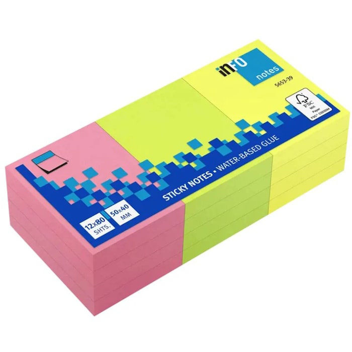 Ο κύβος αυτοκόλλητων χαρτιών Info Notes 5565-39 περιλαμβάνει 12 τεμ. σε ζωηρά χρώματα, ιδανικά για σημειώσεις, υπενθυμίσεις και γρήγορες ετικέτες. Κάθε τεμάχιο έχει διαστάσεις 40x50mm, καθιστώντας τα κατάλληλα για μικρά, στοχευμένα μηνύματα πάνω σε οθόνες, φακέλους, τετράδια ή τοίχους.