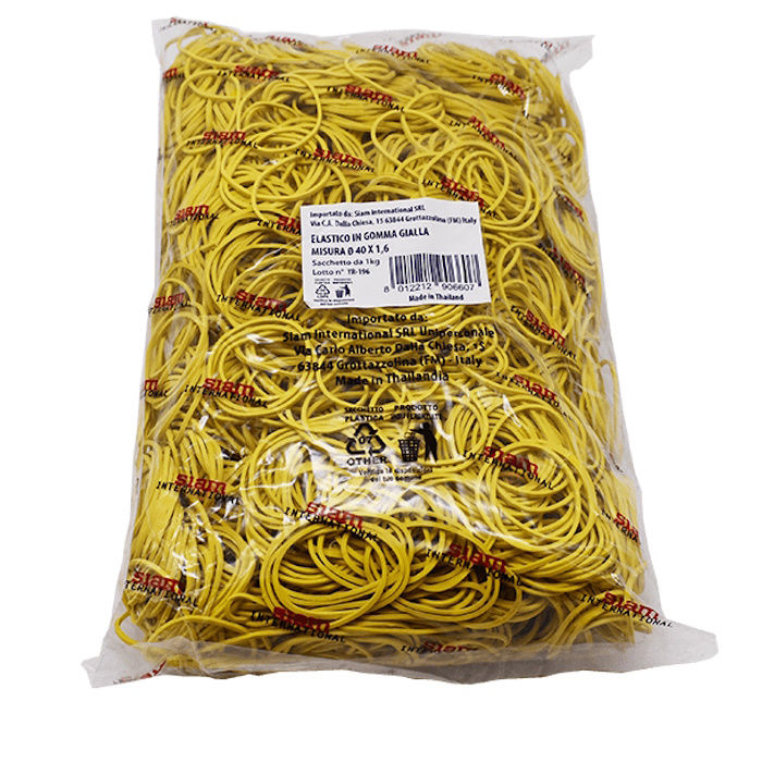 Επαγγελματικά λαστιχάκια καουτσούκ διαμέτρου 40 mm, συσκευασμένα σε πρακτική σακούλα 1 κιλού, για χρήση σε γραφεία, αποθήκες, χειροτεχνίες και βιομηχανικές εφαρμογές.