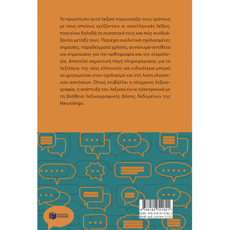 Το πρωτότυπο αυτό λεξικό παρουσιάζει τους τρόπους με τους οποίους «χτίζονται» οι νεοελληνικές λέξεις, ποια είναι δηλαδή τα συστατικά τους και πώς συνδυά¬ζονται μεταξύ τους. Περιέχει αναλυτικά σχολιασμένες σημασίες, παραδείγματα χρήσης, συνώνυμα-αντίθετα και σημειώσεις για την ορθογραφία και την ετυμολογία. Αποτελεί σημαντική πηγή πληροφόρησης για το λεξιλόγιο της νέας ελληνικής, και ειδικότερα μπορεί να χρησιμεύσει στον σχεδιασμό και στη λύση γλωσσικών ασκήσεων. Όπως επιβάλλει η σύγχρονη λεξικογραφία, η ανάπτυξη του λεξικού έγινε ηλεκτρονικά με τη βοήθεια λεξικογραφικής βάσης δεδομένων της Neurolingo.