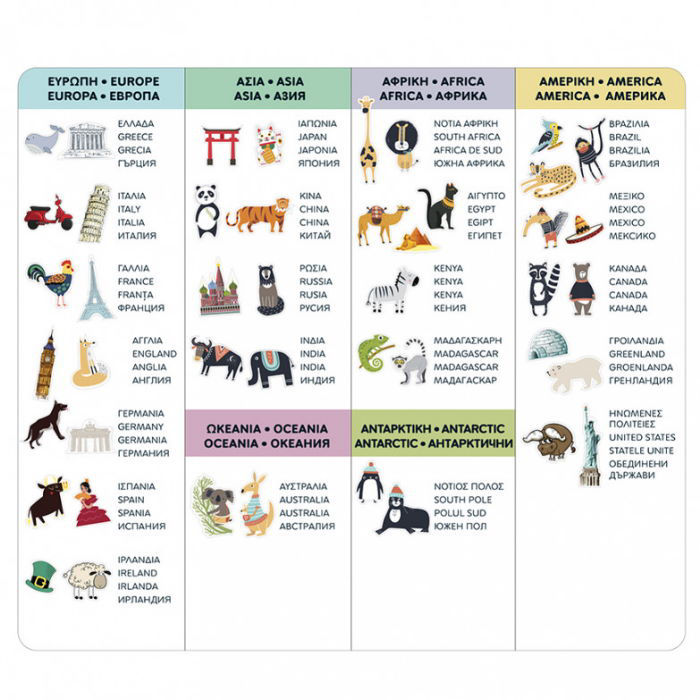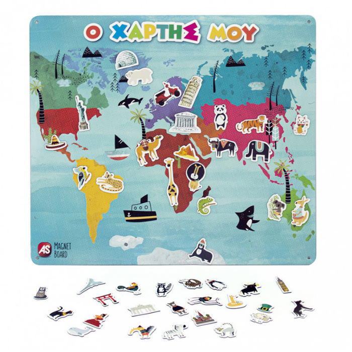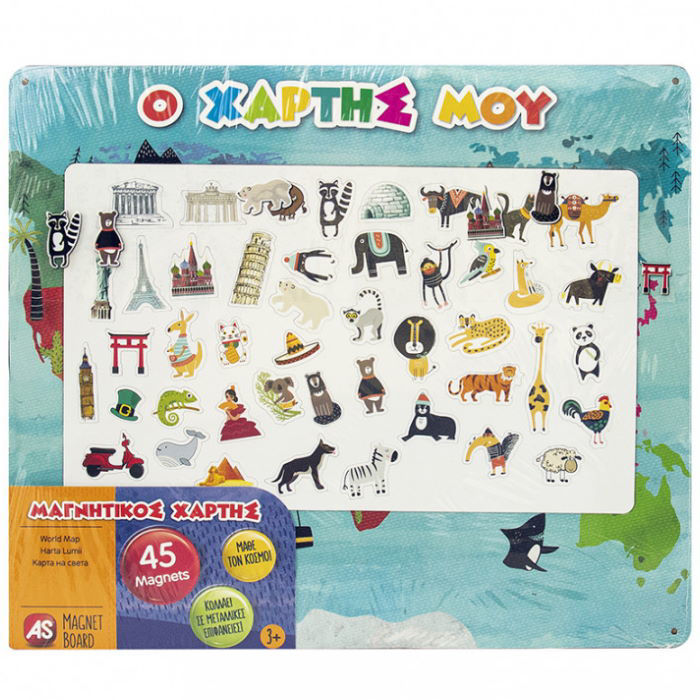 Μέσα από το παιχνίδι με μαγνήτες το παιδί μαθαίνει και εξοικειώνεται με τον πιο διασκεδαστικό τρόπο με τις ηπείρους και χώρες τους. 45 μαγνήτες στη μορφή των πιο χαρακτηριστικών αξιοθέατων και ζώων της κάθε χώρας περιλαμβάνονται στο σετ και με τη βοήθεια εικονογραφημένου οδηγού, βοηθούν το παιδί να τους τοποθετήσει στο σωστό σημείο του χάρτη.