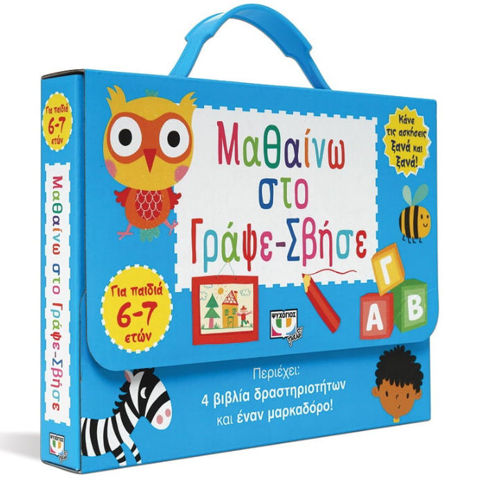 Ανακαλύψτε μέσα σε αυτό το βαλιτσάκι 4 απίθανα βιβλιαράκια γράψε-σβήσε με εκπαιδευτικές δραστηριότητες ιδανικές για παιδιά ηλικίας 6 έως 7 ετών. Απλές προσθέσεις, η προπαίδεια, η εκμάθηση της ώρας και η γραφή πρώτων λέξεων γίνονται παιχνίδι μέσα από τη χαριτωμένη εικονογράφηση και τον μαρκαδόρο γράψε-σβήσε!