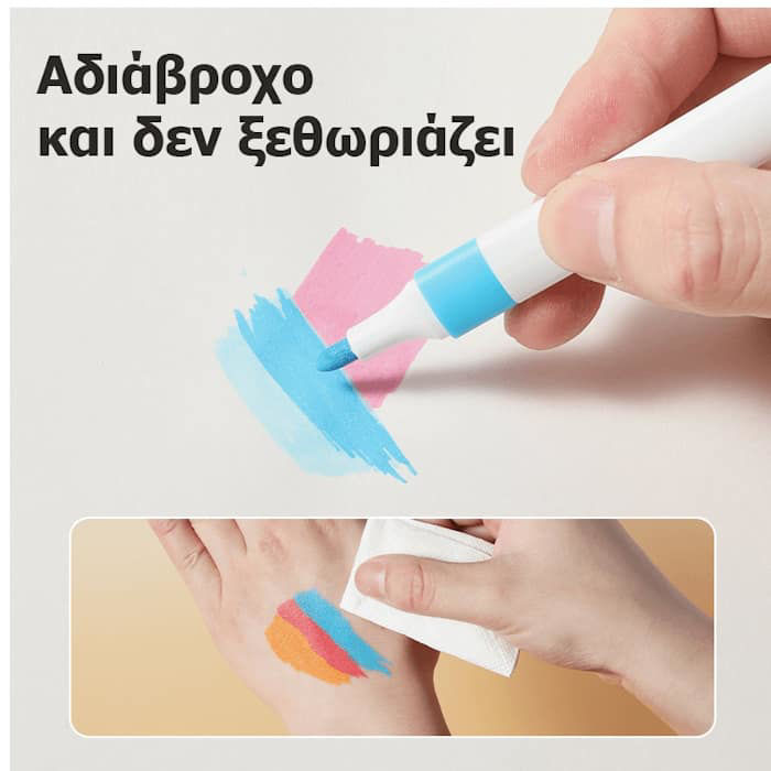 Η μύτη ακριβείας επιτρέπει καθαρά περιγράμματα και εύκολη εφαρμογή σε λεπτομέρειες ή μεγάλες επιφάνειες. Τα χρώματα στεγνώνουν γρήγορα και προσκολλώνται άψογα σε διάφορα υλικά όπως χαρτί, ξύλο, πλαστικό, πέτρα ή καμβά, χωρίς να μουτζουρώνουν ή να ξεθωριάζουν.