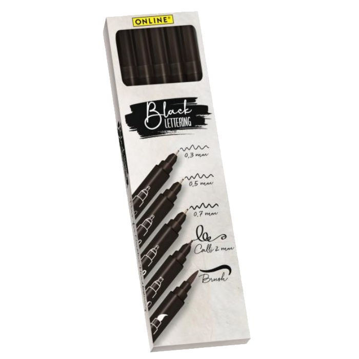 Τα μαρκαδοράκια καλλιγραφίας Online διαθέτουν μαύρο πλαστικό στέλεχος και μελάνι με βάση το νερό, προσφέροντας ομαλή και σταθερή ροή γραφής. Το σετ περιλαμβάνει πέντε διαφορετικά πάχη γραμμής, 0.3mm, 0.5mm, 0.7mm, 2.0mm και ένα μαρκαδοράκι πινέλο, ιδανικά για καλλιγραφία, lettering και δημιουργική γραφή.