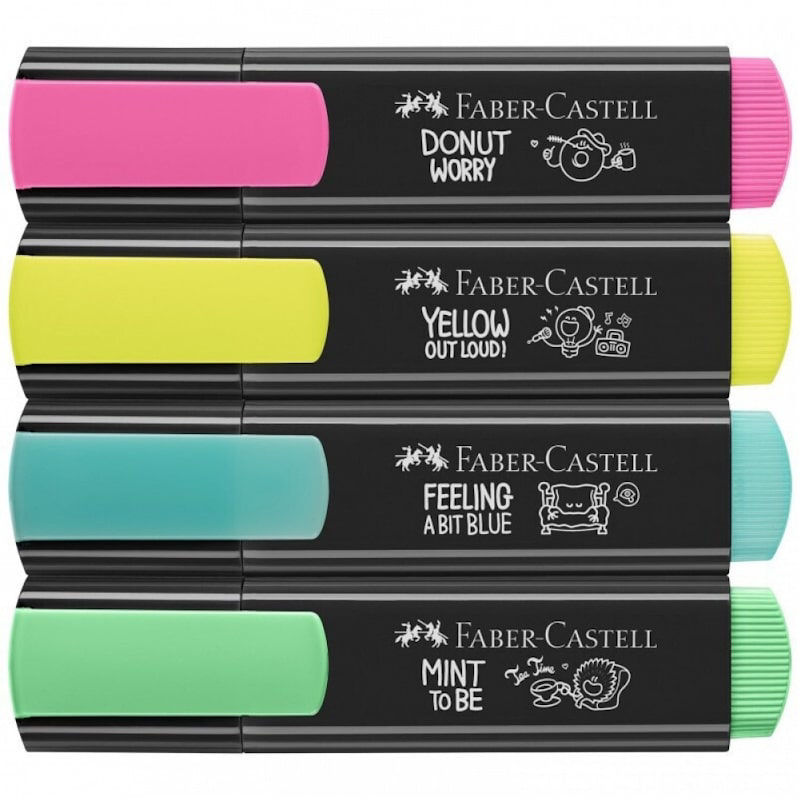 O μαρκαδόροι υπογράμμισης 46 σε neon χρώματα εγγυάται υπογράμμιση με απαλά και φωτεινά χρώματα, χωρίς μουτζούρες, σε όλους τους συνηθισμένους τύπους χαρτιού. Το σετ Faber-Castell Textliner 46 Funny Edition περιλαμβάνει 4 υπογραμμιστές neon με μοναδικά χρώματα και ατάκες (quotes) που θα σας φτιάξουν τη διάθεση, όπως "Donut Worry", "Feeling a bit blue", "Yellow Out Loud!" και "Mint To Be".