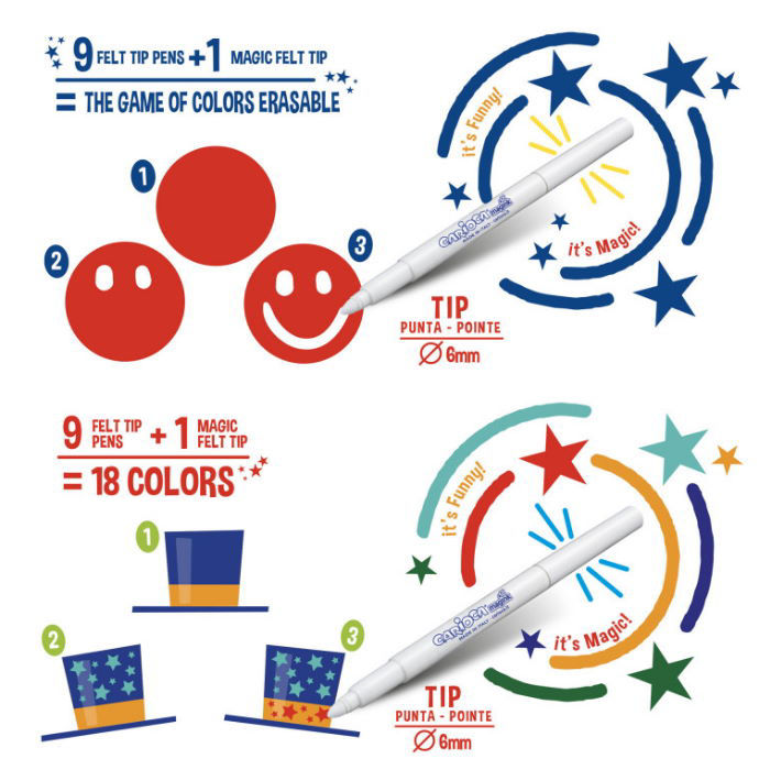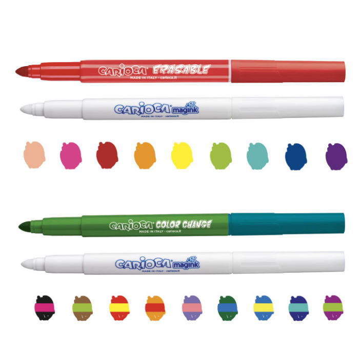 Και 9 μαρκαδόρους Cambiacolor που αλλάζουν χρώμα όταν ζωγραφίσουμε επάνω με το 2ο μαγικό λευκό.