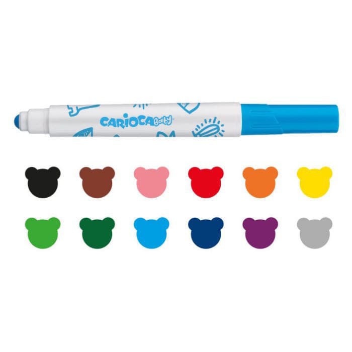 Μαρκαδόροι υψηλής ποιότητας ειδικά σχεδιασμένοι για νήπια. Το σχήμα και το μέγεθος τους επιτρέπουν εύκολη και σωστή χρήση. Η μύτη είναι στρογγυλεμένη για μέγιστη ασφάλεια και μεγαλύτερη για να καλύπτει μεγάλες επιφάνειες γρήγορα και χωρίς κόπο. Το μελάνι καθαρίζεται εύκολα μόνο με νερό και χρησιμοποιούνται χρωστικές ουσίες φαγητών μόνο. Χωρίς κανένα κίνδυνο και απόλυτα ασφαλείς. Δερματολογικά ελεγμένο.