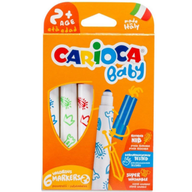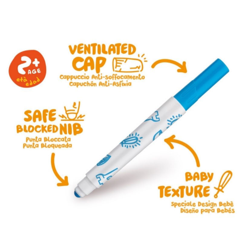 Οι Carioca Baby Jumbo είναι μαρκαδόροι ειδικά σχεδιασμένοι για παιδιά ηλικίας 2 ετών και άνω, προσφέροντας ασφαλή και διασκεδαστική εμπειρία ζωγραφικής. Το εργονομικό τους σχήμα και η χοντρή κατασκευή τους επιτρέπουν εύκολο κράτημα από μικρά χεράκια, ενώ η στρογγυλεμένη και μπλοκαρισμένη μύτη εξασφαλίζει μέγιστη ασφάλεια κατά τη χρήση.
