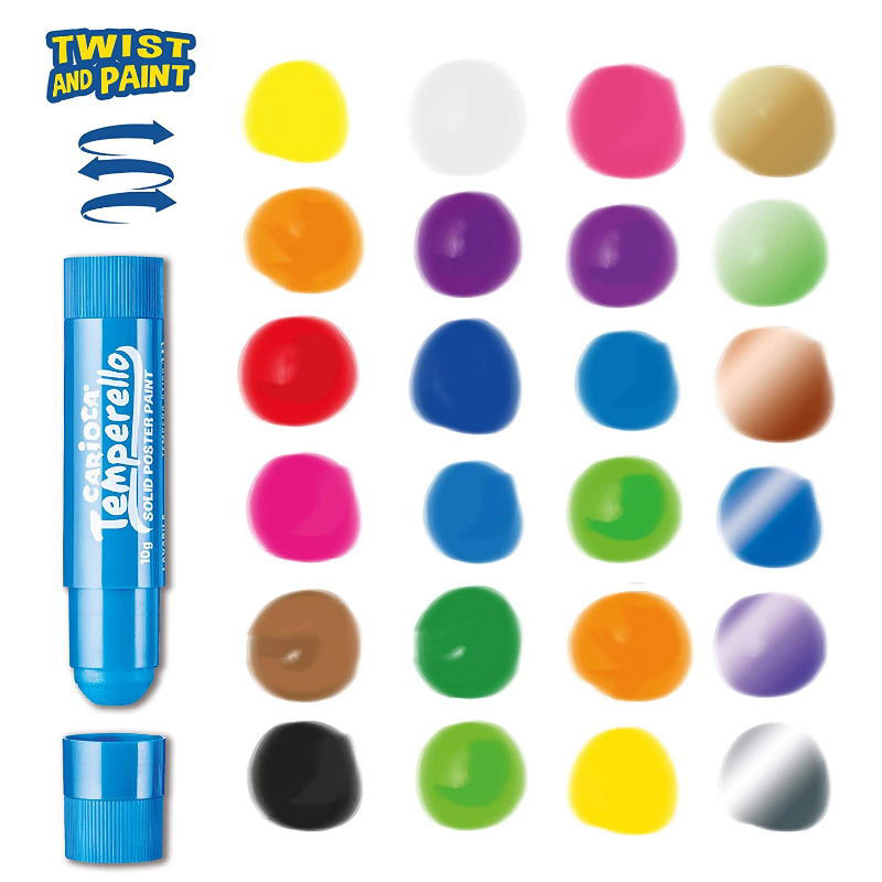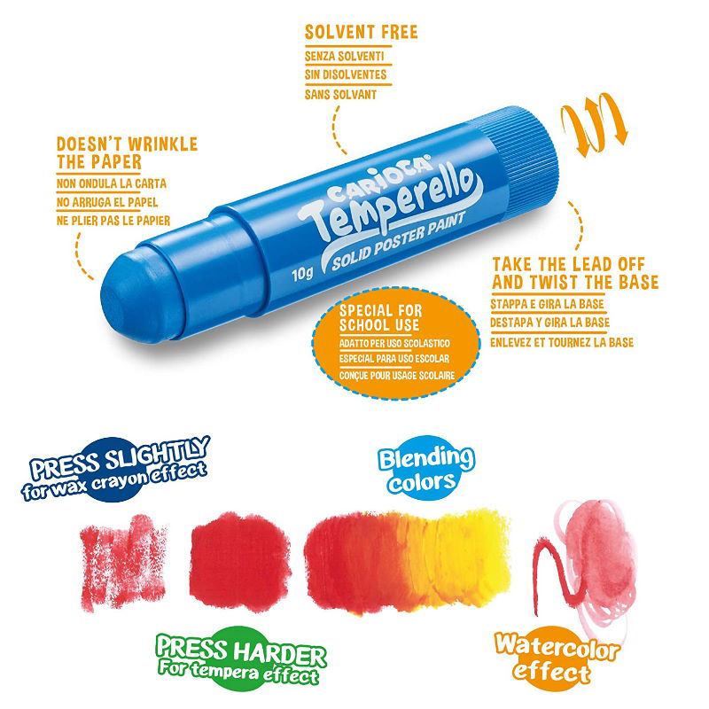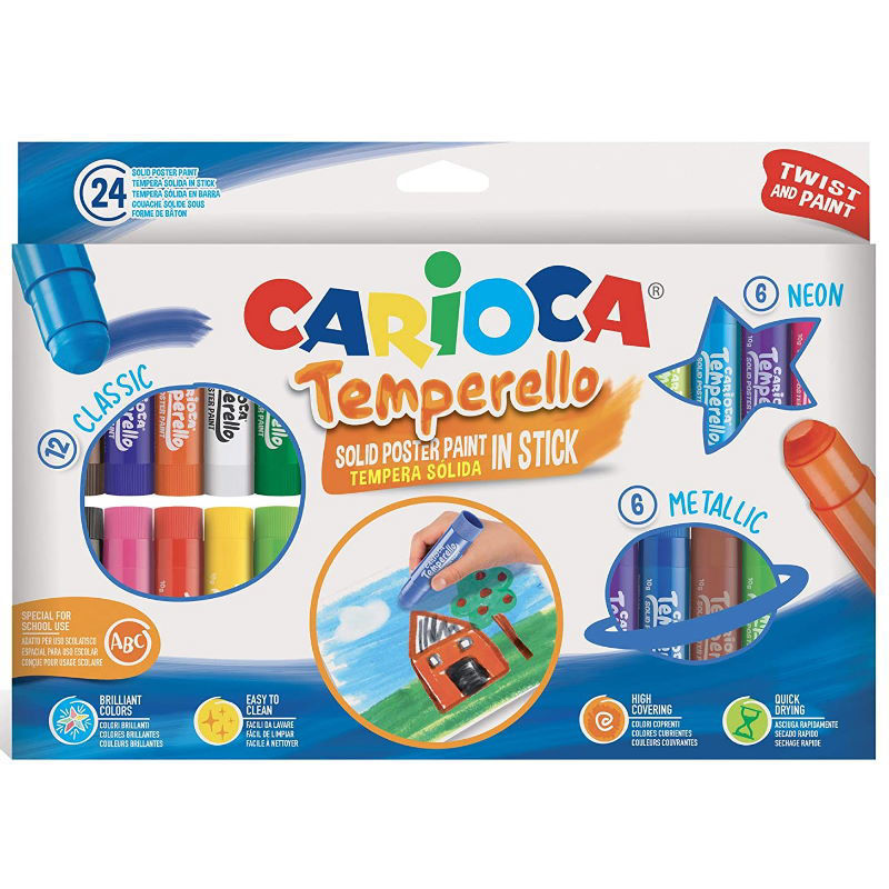 Οι Carioca Temperello είναι μαρκαδόροι-στικ τέμπερας, ιδανικοί για ζωγραφική χωρίς βούρτσες, νερό ή ακαταστασία! Το σετ περιλαμβάνει 24 έντονα χρώματα, με απαλή, καλυπτική υφή που στεγνώνει γρήγορα, αφήνοντας ματ φινίρισμα. Ιδανικοί για χαρτί, χαρτόνι, ξύλο και άλλες απορροφητικές επιφάνειες.