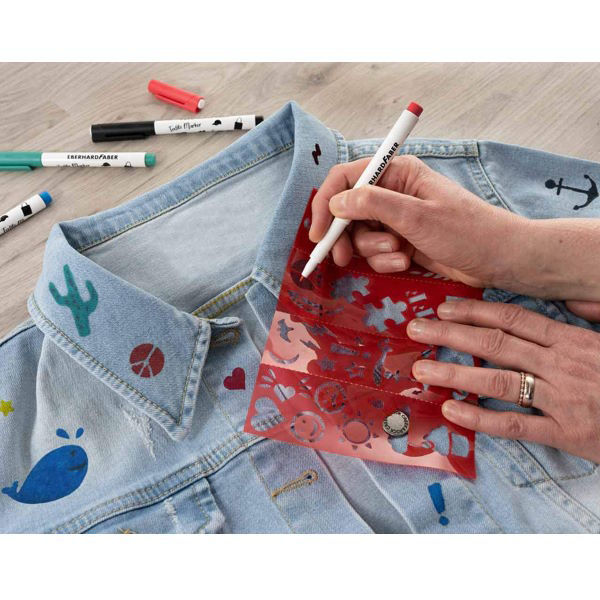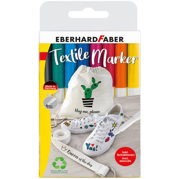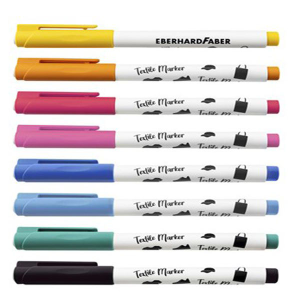 Μαρκαδόροι για ύφασμα Eberhard Faber Textile 8 τμχ (5782-08). Μαρκαδόροι για τατουάζ και ύφασμα σε 8 φωτεινά χρώματα. Το άκρο της μύτης είναι ιδανικό για μικρά σχέδια και μεγαλύτερες περιοχές.Το χρώμα γίνεται στεραιό μετά από 24 ώρες ή αμέσως μετά το σιδέρωμα (χωρίς λειτουργία ατμού). Τα υφάσματα μπορούν να πλυθούν έως και 60 C. Eίναι κατάλληλο για πολλά υφάσματα.