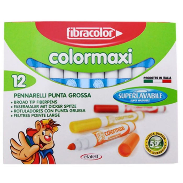 Μαρκαδόροι 12 τεμ. χοντροί Fibracolor Πλενόμενοι. Συνθετική μύτη γραφής 5 mm. Σώμα με ειδικό σχεδιασμό για σώστο και εύκολο κράτημα. Βοηθά στο χρωμάτισμο μεγάλων επιφανειών. Μελάνι μη τοξικό οικολογικό που καθαρίζει έυκολα και αεροζόμενο καπάκι ασφαλείας. Περιέχει 5 γρ. μελανιού όταν οι άλλοι έχουν 2,5 γρ.