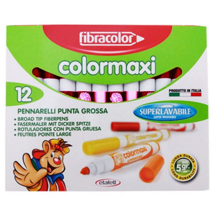 Μαρκαδόροι 12 τεμ. χοντροί Fibracolor Πλενόμενοι. Συνθετική μύτη γραφής 5 mm. Σώμα με ειδικό σχεδιασμό για σώστο και εύκολο κράτημα. Βοηθά στο χρωμάτισμο μεγάλων επιφανειών. Μελάνι μη τοξικό οικολογικό που καθαρίζει έυκολα και αεροζόμενο καπάκι ασφαλείας. Περιέχει 5 γρ. μελανιού όταν οι άλλοι έχουν 2,5 γρ.
