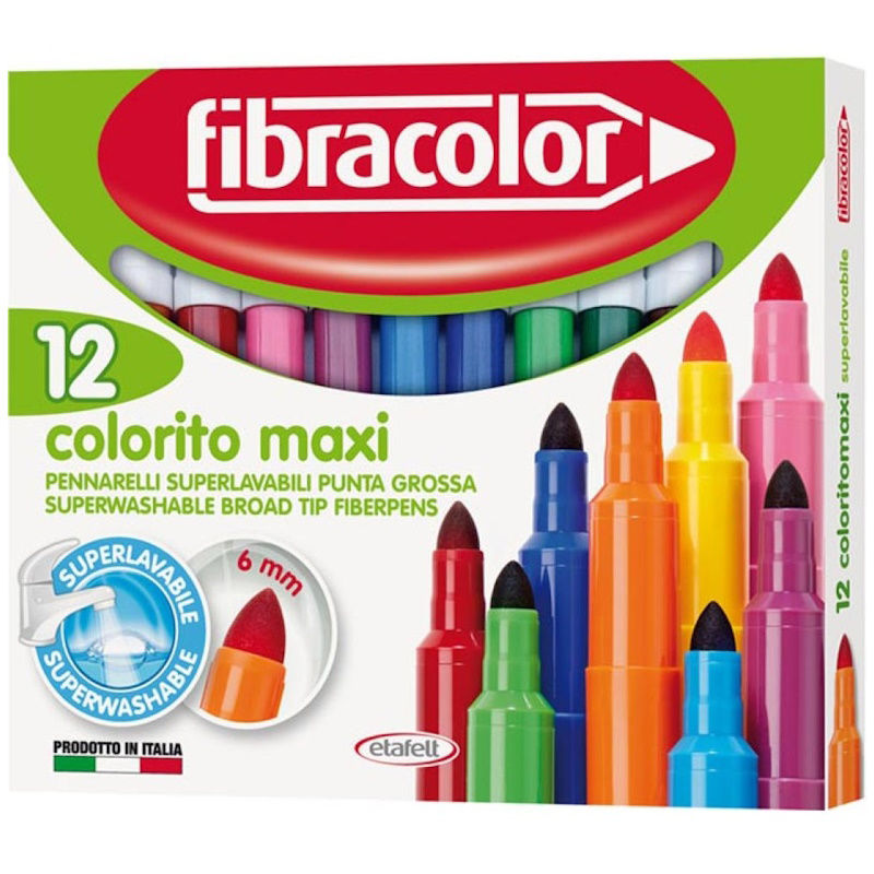 Μαρκαδόροι 12 τεμ. χοντροί Fibracolor Πλενόμενοι. Συνθετική μύτη γραφής 6 mm. Σώμα με ειδικό σχεδιασμό για σώστο και εύκολο κράτημα. Βοηθά στο χρωμάτισμο μεγάλων επιφανειών. Μελάνι μη τοξικό οικολογικό που καθαρίζει έυκολα και αεροζόμενο καπάκι ασφαλείας.
