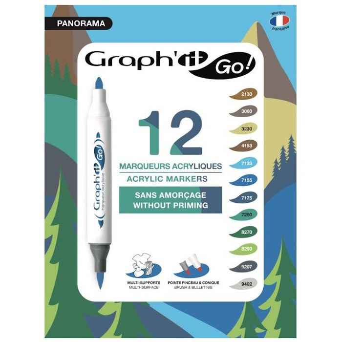 Οι Graph’-It GO Landscape είναι ακρυλικοί μαρκαδόροι 12 τεμαχίων με διπλή μύτη — πινελοειδής για εύκολη υγρή βάψη και κωνική (~1 mm) για λεπτομέρειες. Η σειρά “Landscape” προσφέρει παλέτα γήινων, ήπιων τόνων εμπνευσμένων από φυσικά τοπία, ιδανική για τοπιογραφίες, sketching και mixed-media δημιουργίες.