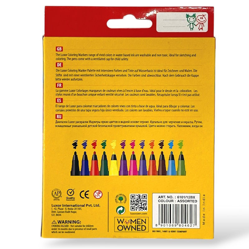 Οι μαρκαδόροι Luxor είναι μελάνι με βάση το νερό, πλένονται εύκολα και είναι μη τοξικοί. Ιδανικοί για σχέδιο και χρωματισμό. Περιλαμβάνουν ειδικό καπάκι ασφαλείας με αεραγωγό για την προστασία των παιδιών.